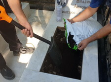 К сожалению, в самый разгар работы нас застал дождь. Так как реставрация требовала сухой погоды, то мы закрыли место захоронения плёнкой и покинули кладбище, отложив восстановление на несколько суток.