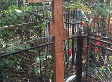 Могила стандартная, не большая. Когда-то здесь стоял гранитный памятник и была высокая ограда. После очередного захоронения плиту убрали в сторону, цветник тоже подняли, переднюю часть ограду демонтировали, установили временный крест.